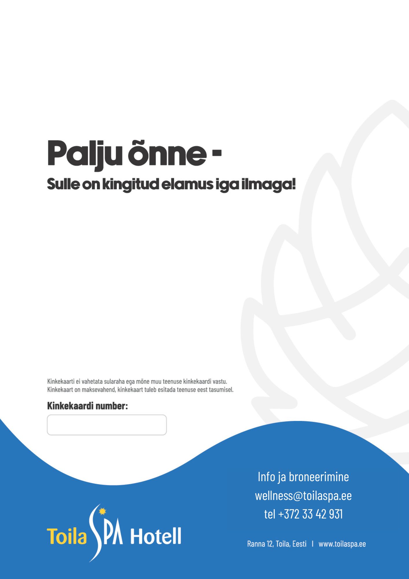 - Kinkekaarti ei vahetata raha ega mõne muu teenuse kinkekaardi vastu